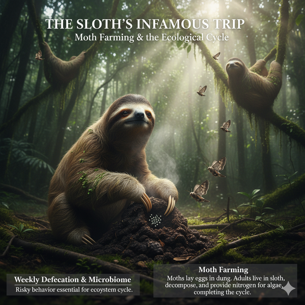 Moth Farming: During this trip, specialized species of sloth moths lay eggs in the dung. The adult moths then fly back up to the canopy to live in the sloth’s fur, where their decomposing bodies eventually provide more nitrogen for the algae, completing the entire ecological cycle.